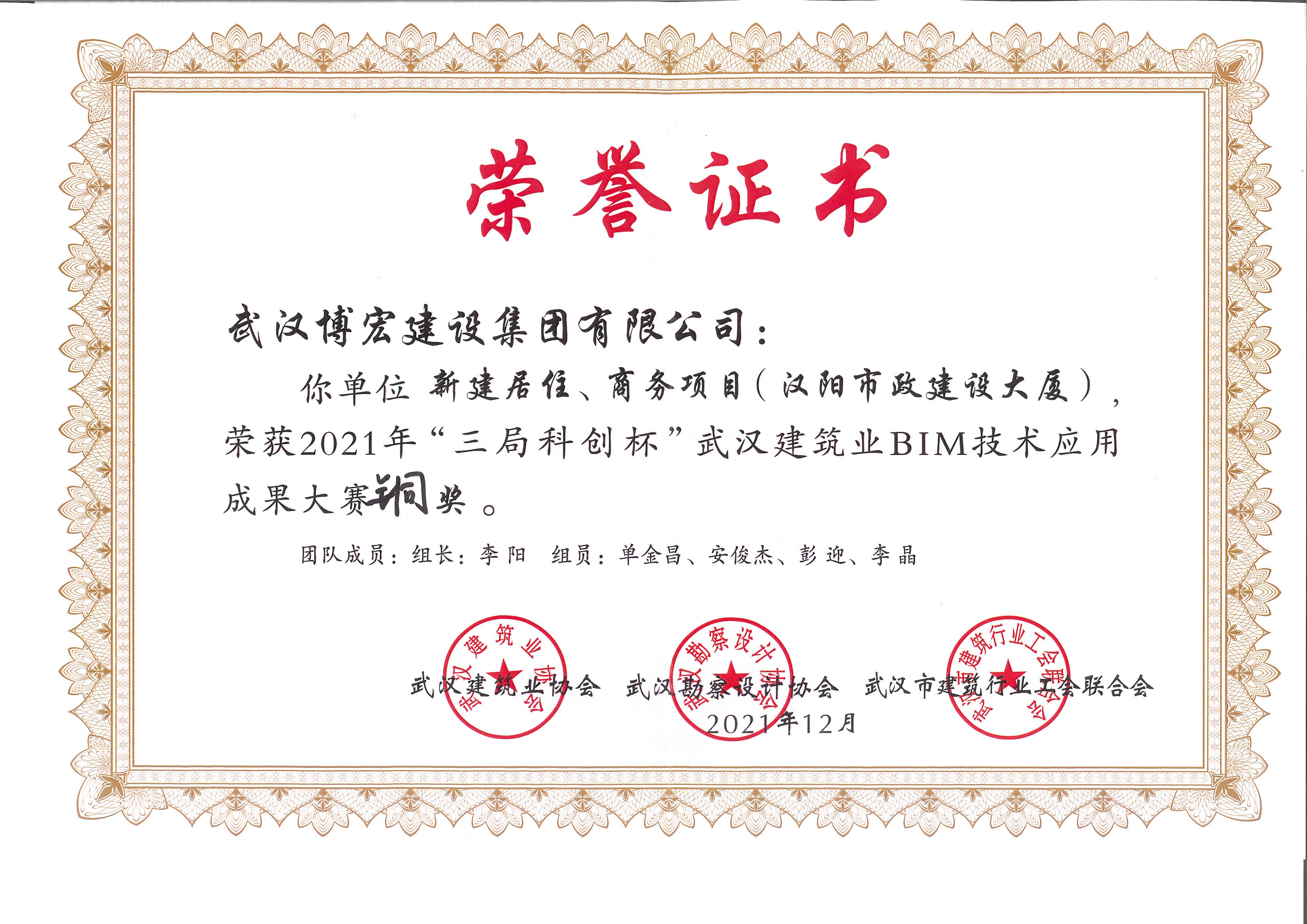 漢陽市政大廈2021年“三局科創(chuàng)杯”武漢建筑業(yè)BIM技術(shù)應(yīng)用成果大賽銅獎