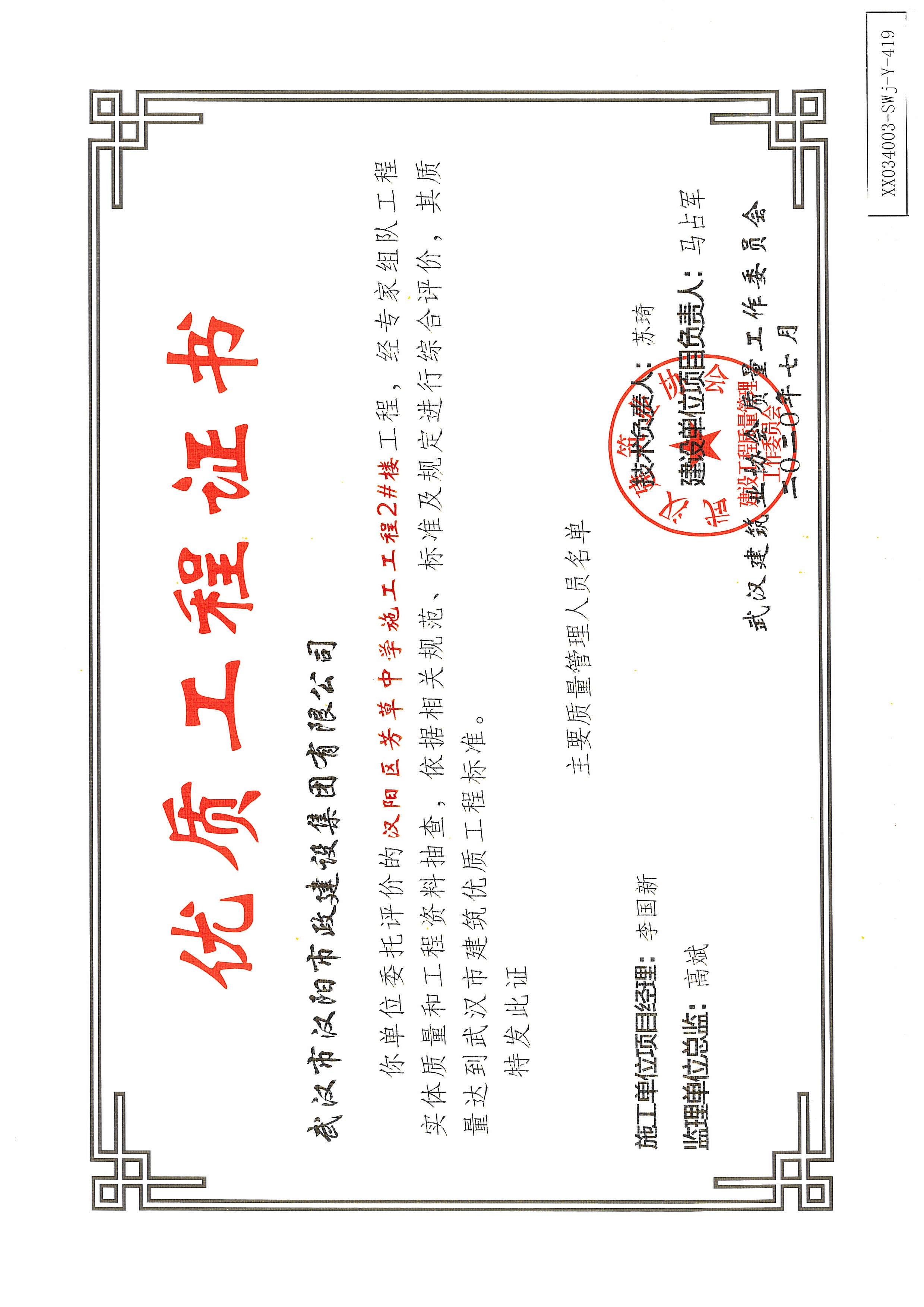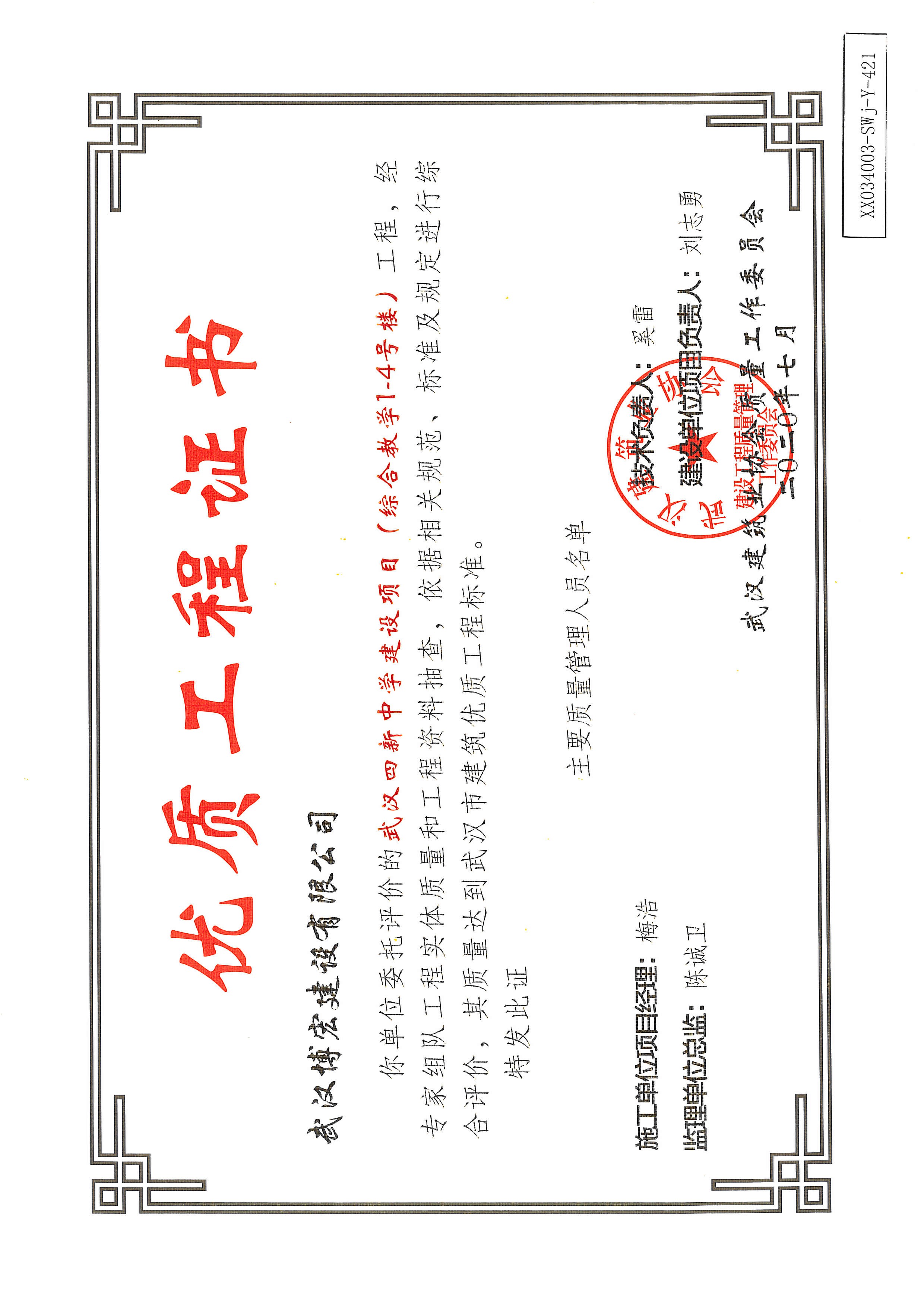 優(yōu)質(zhì)工程證書(武漢四新中學建設項目(教學樓)