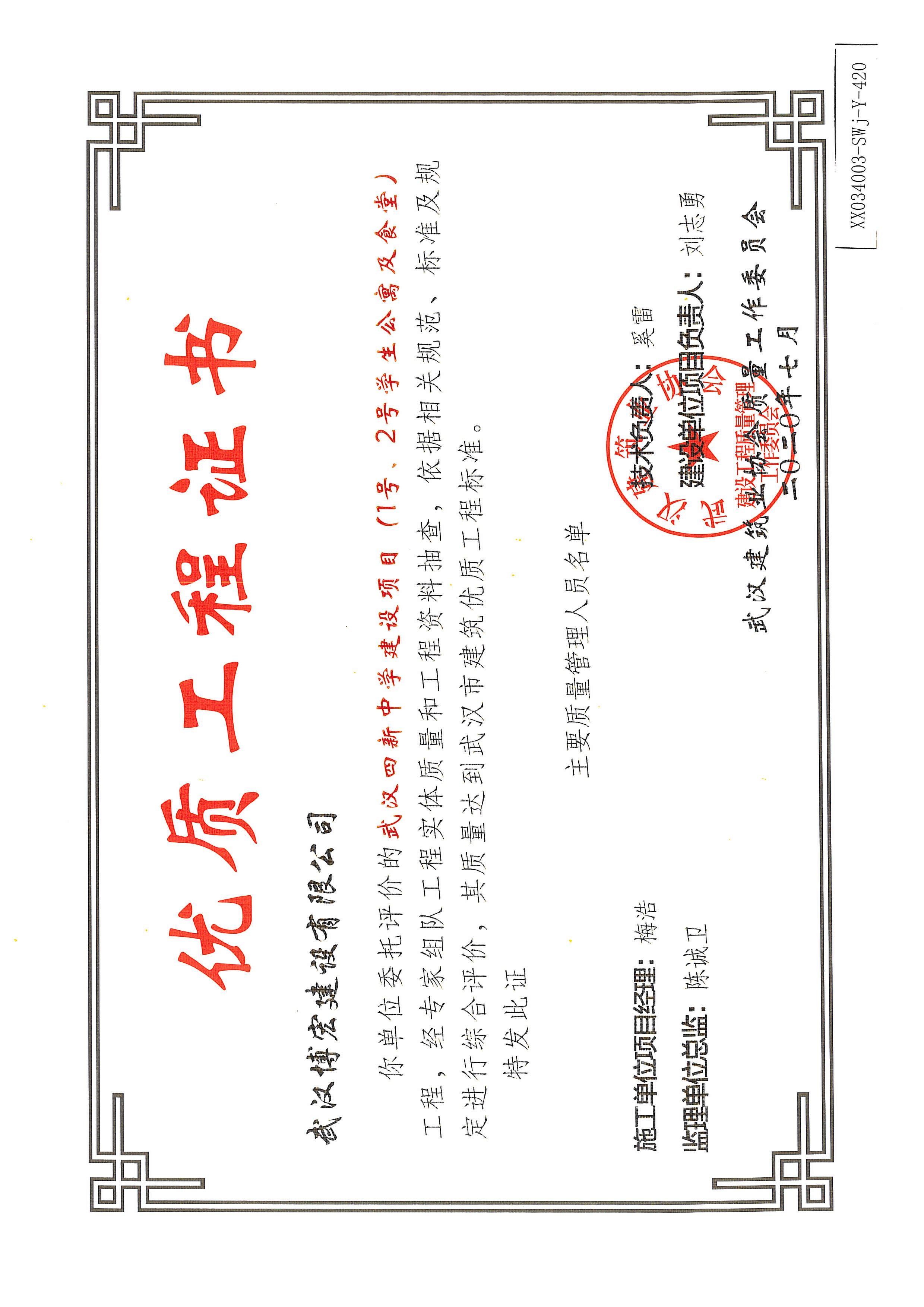 優(yōu)質(zhì)工程證書(武漢四新中學建設項目工程(1、2號學生公寓及食堂)