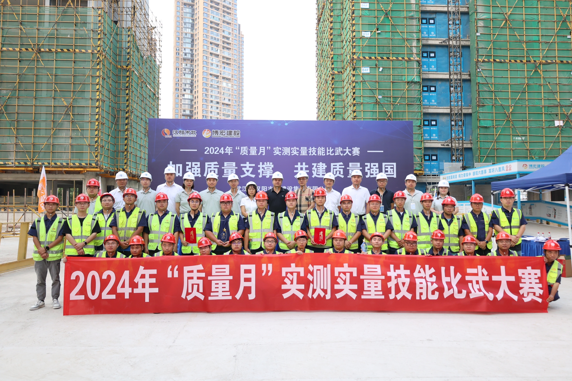 為響應(yīng)“質(zhì)量月”活動(dòng)號(hào)召,增強(qiáng)全員質(zhì)量意識(shí),促進(jìn)公司質(zhì)量全面提升,9月26日下午,博宏建設(shè)集團(tuán)2024年“質(zhì)量月”實(shí)測(cè)實(shí)量技能比武大賽在國(guó)博D12地塊項(xiàng)目順利舉行,博宏建設(shè)集團(tuán)總經(jīng)理助理李暉,質(zhì)量管理部部長(zhǎng)姜昊,各項(xiàng)目部質(zhì)檢員、施工員共計(jì)五十余人參加活動(dòng)。本次活動(dòng)特別邀請(qǐng)到漢陽(yáng)市政、深圳瑞捷、匯科檢測(cè)等單位專(zhuān)業(yè)代表作為裁判。
